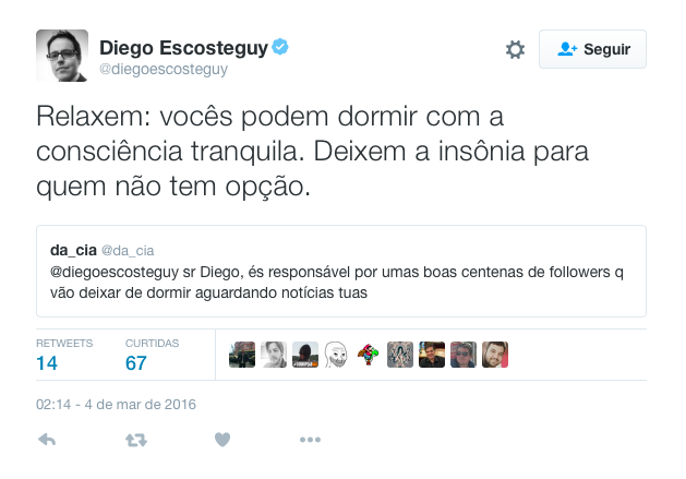 Às 2h14: “Relaxem: vocês podem dormir com a consciência tranquila. Deixem a insônia para quem não tem opção.”