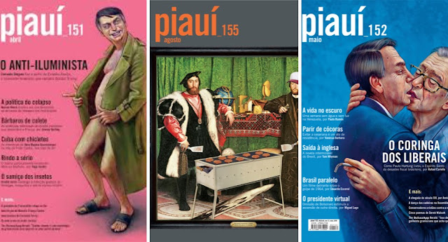 O filho Eduardo Bolsonaro, aspirante a embaixador cujas credencial ventilada é ter sido chapeiro nos EUA, figurado numa paráfrase do quadro “O Embaixadores” (1533) de Hans Holbein; ou Bolsonaro caracterizado com um tiozão depravado nu, dentro de um overcoat, são exemplos dessa caprichada sátira. À primeira vista, parece que a Piauí é crítica, transgressiva – uma revista corajosa e independente que não poupa o próprio presidente.