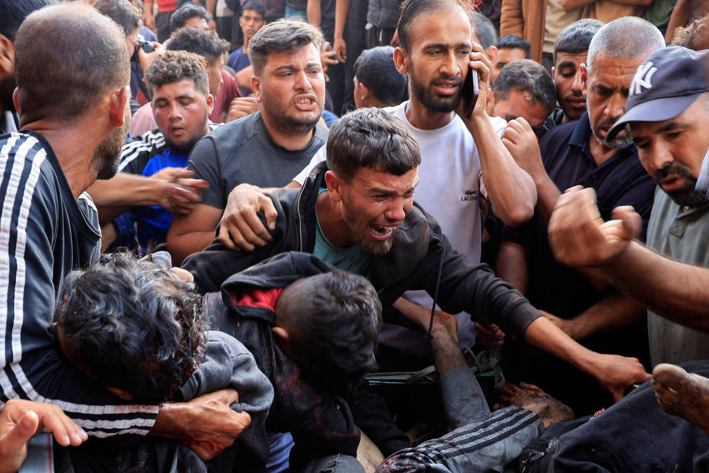 foto: Palestinos ao lado de mortos e feridos por ataque israelense a centro de distribuição de alimentos em Khan Yunis, em Gaza, nesta terça (17). Foto: Hatem Khaled/Reuters
