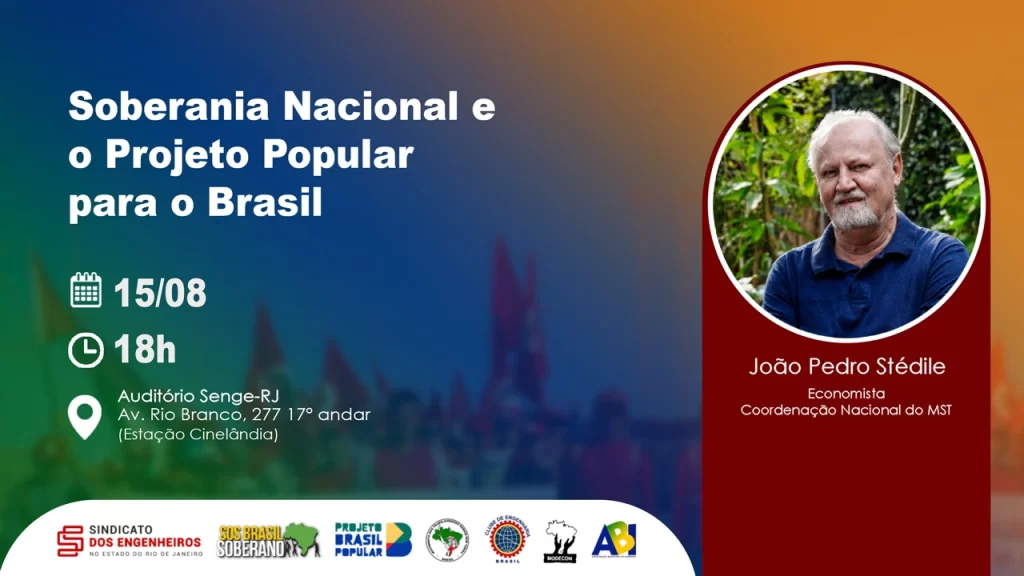 O Senge/RJ, o Movimento SOS Brasil Soberano, MST e Projeto Brasil Popular promovem o encontro que tratará da tensa conjuntura política atual e terá como protagonista o economista João Pedro Stédile, coordenador nacional do MST. Stédile reagirá a provocações do professor Roberto Amaral e dialogará com a plateia formada por parlamentares, sindicalistas, jornalistas, professores e estudantes.